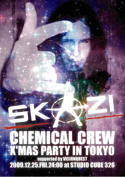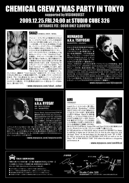 CHEMICAL CREW X'MAS PARTY IN TOKYO supported by visionquest 2009/12/25(fri) OPEN/START : 24:00 @Studio Cube326 ENTRANCE FEE >> DOOR ONLY: 3,000yen ■CHEMICAL CREW X'MAS FLOOR >> 2F 【CHEMICAL CREW X'MAS SPECIAL SET】 ・SKAZI(CHEMICAL CREW/ISRAEL) http://www.myspace.com/skazi_asher 【SPECIAL X'MAS SET】 ・AMI(VISIONQUEST) http://www.myspace.com/ami00cat ・NUMANOID a.k.a TSUYOSHI(MADSKIPPERS/JOUJOUKA) http://www.myspace.com/djtsuyoshi http://www.madskippers.com ・YO