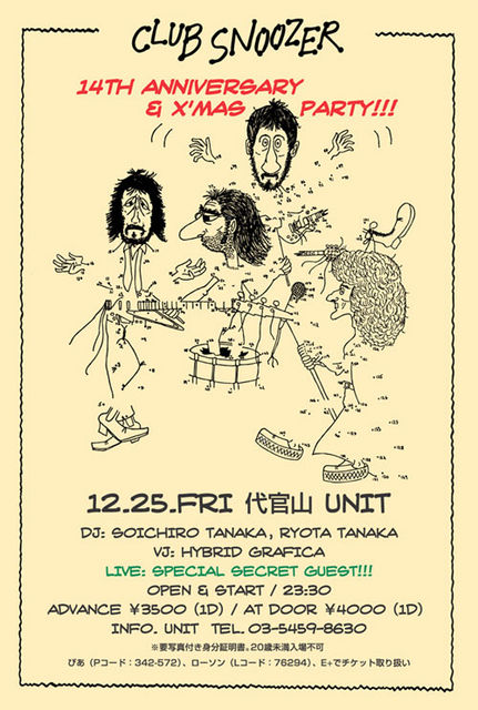 CLUB SNOOZER 14TH ANNIVERSARY & X'MAS PARTY DJ : Soichiro Tanaka Ryota Tanaka SPECIAL GUEST LIVE:くるり http://www.quruli.net/ VJ : HYBRiD grafica OPEN : 23:30 START : 23:30 CHARGE : ADV.3,500yen/DOOR 4,000yen (共に1ドリンク付) ※未成年者の入場不可・要顔写真付きID TICKET : 11/21(SAT) on sale チケットぴあ 0570-02-9999 [P]342-572 ローソン [L]76294 e+ http://www.unit-tokyo.com/schedule/2009/12/25/091225_club_snoozer.php