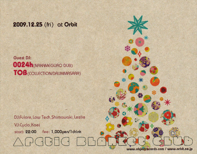 今年最後のabcです。 ゲストにはNAKAMEGURO DUB主催の0024hさん(aka 等々力七丁目) DRUMMASARA、SCUBA等で活動中のTOBさんをお迎えします。 年末スペシャルには欠かせないアノ人の登場にも期待! ご一緒にHOTなクリスマスを過ごしましょう★ Arctic Blanket Club 28 2009/12/25 (金) at Orbit Guest DJ: 0024h(NAKAMEGURO DUB) TOB(COLLECTION/DRUMMASARA) DJ: Fulore, Low Tech, Shimawaki, Leslie VJ: Cyclo, Koei start : 22:00 fee : 1000yen/1drink INFO: http://www.objectrecords.com h