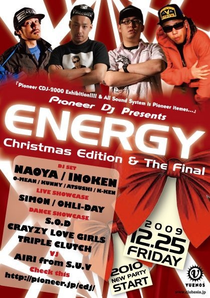 管理人様、告知失礼致します。 2009/12/25 (金) 「ENERGY -Special & The Final-」 @ VUENOS TOKYO & Lounge NEO OPEN 23:00 PRICE \3000/1d, W/F \2500/1d ■VUENOS SIDE■ [DJ] NAOYA / INOKEN / O-MEAN / KUNNY / ATSUSHI / K-KEN [LIVE SHOWCASE] SIMON [DANCE SHOWCASE] S.O.D / CRAZY LOVE GIRLS / TRIPLE CLUTCH [MC] OHLI-DAY [VJ] AIRI ■NEO SIDE■ [GUEST DJ] CELORY a.k.a. Mr.BEATS [DJ] MINORUN / TATSU / BABY-T / SHANDY / LATE / IBA / TERU ゲストご希望の場合はご連絡い