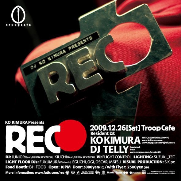 管理人様 失礼します。 絶えず時代の先端を見据えながらカッティングエッジな選曲と卓越したスキルでプロとして24年DJし続けてきたKO KIMURA。そのKO KIMURAのホームグラウンドとなるレジデントパーティーがREC●だ。技術の進歩とともに変化するDJテクノロジーをいち早く取り入れてきたKO KIMURAは数年前からPC DJでプレイしているが、REC●ではこのデジタル音源のみによるDJという現代のDJスタイルをフィーチャー。DJブースにもはやターンテーブルはなく、サウンドシステムはデジタルサウンドのダイナミズムを最大化すべく特別にチューニング。オ