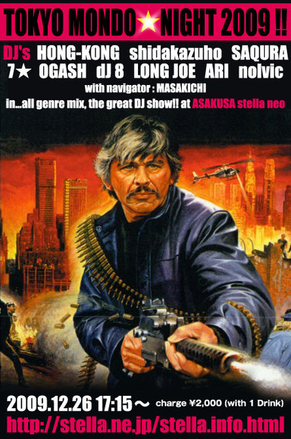 “EROモンドシリーズ” “江古田フィーバーJ” といった人気イベントを経て、 いよいよ真打であるあの世界最強ろくでなしDJイベント、 “TOKYOモンド☆ナイト 2009” が1年ぶりの復活開催でございます!! この一年、共に音楽を共有してきた “最強のモンドDJ” たちである9名が総結集し、 文字通り’09年を総括させるべく、激烈モンドタウンであるASAKUSAで、 飲んで踊って歌って狂いまくりたいと思ってますので、是非是非ご参加くださいませ。 因みにこの9名のDJ陣が現在のところ、 都内最強の破壊力を持ったサイボーグ009たちDEATH (意味