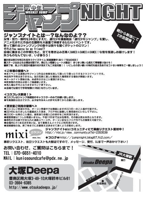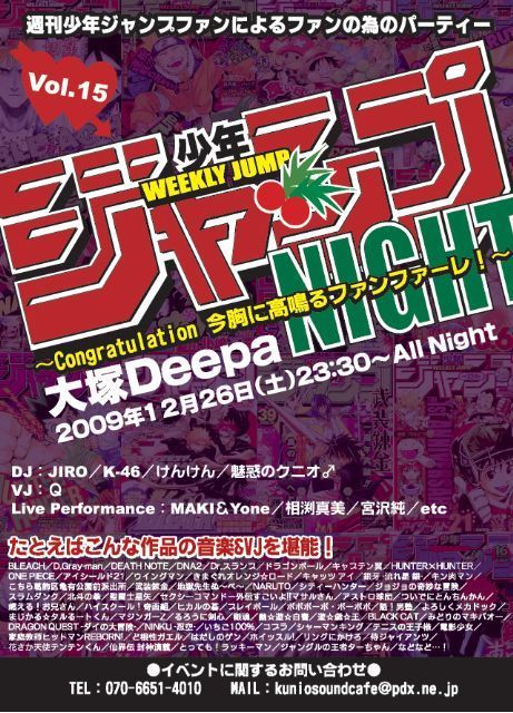 お世話になっております。 “ジャンプナイト”は一晩ジャンプ楽曲づくしのお祭りです。 内容、興奮度共に、 最高テンションを続け2009年を燃えて駆け抜けた今、 メリー・クリスマス・アフターパーティーで今年を締めくくりたいと思っております! いつもの皆さん、そしてもちろんはじめてご参加の方も大歓迎! な、ピースフル空間はそのままでお待ちしていますので、 今回もお誘い合わせの上、ご予定頂けます様よろしくお願いしますね! “ジャンプナイトVol.15” 〜Congratulation 今胸に高鳴るファンファーレ!〜 日時:12/2