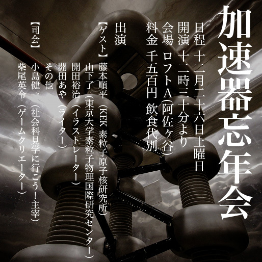 今年最後の社会科見学に行こう!のイベントは「加速器忘年会」です! いつものKEK藤本先生、東大山下先生をお招きして、 今年稼働しはじめたJ-PARCのお話や、先日再スタートしたCERNのLHCのお話、そして何より事業仕分けで加速器ってどうなっちゃうの?というような話をしたいと思います。 忘年会ということで、いつも時間が足りない質問コーナーも今回は1時間くらいもうけますので、先生方に聞きたいことを思う存分聞いちゃってください! 社会科見学に行こう!Presents 見学デーvol.4 加速器忘年会 日程:2009年12月26日(土) 会場:ロフ