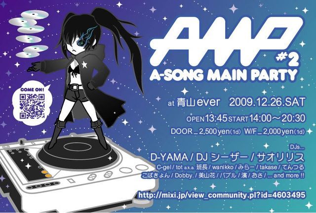 2009年12月26日、新たな伝説がスタートする… 10月にスタートしたNEW STYLE PARTY "AMP" 初回はmixiのみでの募集にも関わらず満員御礼!!! キャンセル待ちが出る程の大成功を収めた。 そのAMPがなんと青山に進出!! 舞台は超有名CLUB "ever"!! Partyを彩るDJは前回Partyを盛り上げたレギュラー陣は勿論、 アニソンDJたちの憧れParty"DENPA"から都市伝説級のゲスト ・D-YAMA ・DJシーザー ・サオリリス が出演決定!! その他にも様々な人気イベントから新たな伝説の幕開けに相応しいDJも続々参戦!!