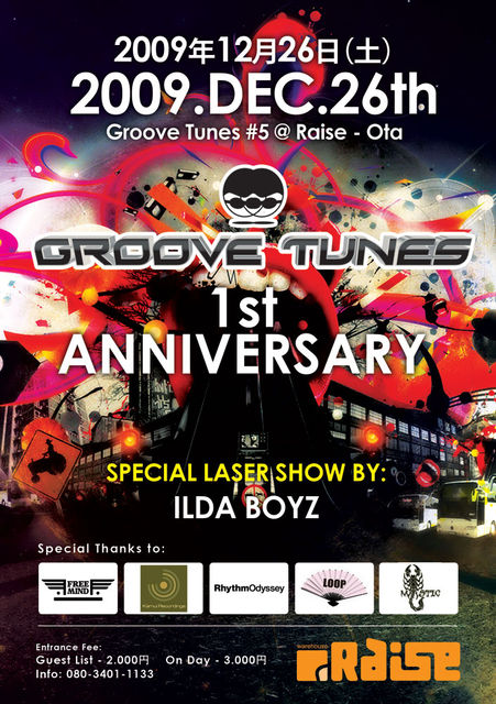▼2009 . DECEMBER . 26 SAT. ☆☆☆GROOVE TUNES☆☆☆ # 05 "1st ANNIVERSARY "@ RAISE ▼LINE UP: ■DJ LUWIS(GROOVE TUNES)KANAGAWA ■DJ JIRAYA(GROOVE TUNES)NAGOYA ■PROG.K A.K.A KEN(GROOVE TUNES/PROGRESSIVA) GUNMA ▼SPECIAL GUEST ■DJ DAIRON ALBA(MINISTRY)TOKYO ▼GUEST DJS: ■DJ DRY-X(MYSTIC)SHIZUOKA ■DJ HITOMI(FREE MIND)NAGOYA ■DJ BIA(FREE MIND)AICHI ■DJ MARCIO HATAMIYA(BOMBAR/PROGRESSIVA) GUNMA ■DJ FIGURA(HELLS PRODUCTION)GUNMA ■DJ TEN-PULA(LOO