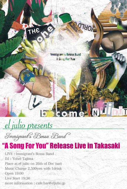 高崎のホームグランド!!! 今年もel julioさんでライブをやらせて頂きます! 皆さん、是非遊びに来て下さい! 2009.12.26.sat. at el julio > http://www.eljulio.jp Fee:2,500yen + 1drink Open 19:00~ / Live 19:30 【Live】 Immigrant's Bossa Band 【DJ】 Yohei Tajima ■ ■ ■ ■ ■ ■ ■ ■ ■ ■ ■ el julio http://www.eljulio.jp 高崎市宮元町17-1 スカイビル1F 027-321-4785 cafe.bar@eljulio.jp