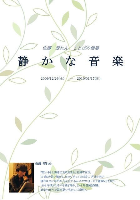 CAFE サーハビーにて「詩」の個展を行います!! ========================================== 2009/12/26(土)〜2009/1/17(日) 佐藤 翠れん ことばの個展 「静かな音楽」 場所:CAFE サーハビー http://www.cafe-sahabi.com ========================================== JAZZボーカリストとして活躍されている佐藤翠れんさんは 以前よりご自身で「詩」を綴ってきました。 どこかあたたかく、そしてやさしく 自然と心に響いてくる言葉の連なり・・・。 みなさんぜひ、佐藤翠れんさんの詩の世界に触れてみてください! 詳