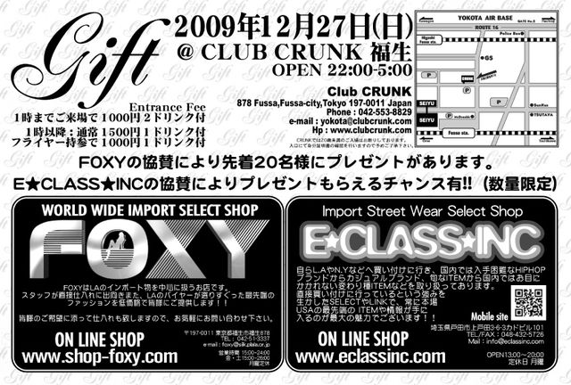 "GIFT" Organized By DJ KO-JI ☆12月27日(San) @福生Club CRUNK ☆Open : 22:00-5:00 ☆Entrace : 1.500yen /1d 1時までにご来場の方1,000円+2Drink フライヤー持参の方1,000円+1Drink フライヤーのない方は、フライヤー画像をエントランスにて掲示でもOK!!! ☆DJs:LIL'JUN, KO-JI, TAKUMI, MASA, SHOWHEY & KOUTA ☆Special☆ レディースショップ”FOXY”の協賛により先着20名の方にSpecial「Gift」 セレクトショップ”E☆CLASS☆INC”の協賛により数量限定のプレゼントあり ■CRUNK HP