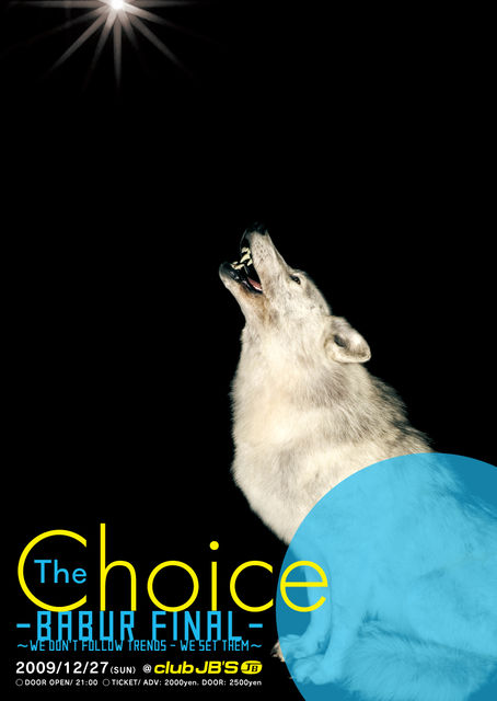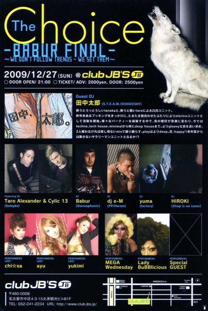 管理人様、告知失礼致します。 The Choice -BABUR FINAL- 〜We don't follow trends - we set them〜 2009/12/27 (SUN) @ CLUB JB'S DOOR OPEN/ 21:00 TICKET/ ADV: 2000yen. DOOR: 2500yen Guest DJ 田中太郎 (S.T.E.A.M./DISKOVSKY) 酔うとうっとうしいtanakaと、酔うと酷いtaroによる凸凹ユニット。 昨年末あるブッキングをきっかけに、たまたま居合わせた