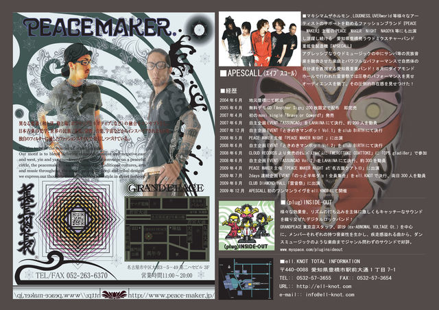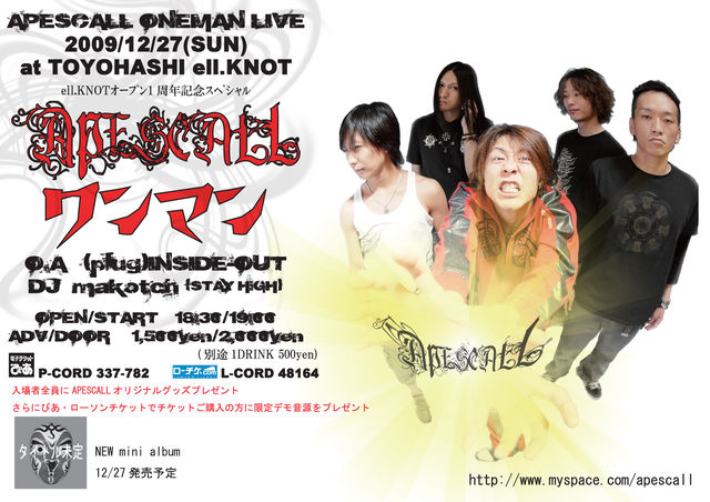いよいよ!! やることになりました!! APESCALLワンマンLIVE!! 皆さん絶対予定は空けてこの日は遊びに来て下さい!! 絶対楽しいこと間違い無しです!! ell.KNOTオープン1周年記念スペシャル 『APESCALLワンマン』 2009/12/27(sun) 豊橋ell.KNOT MAIN ACT:APESCALL OPENING ACT(plug)INSIDE-OUT(from TOKYO) DJ:makotch(STAY HiGH) OPEN/START 18:30/19:00 ADV/DOOR \1500/\2000 (D別途\500) チケット発売 2009/10/3(sat) Pコード:337-782 Lコード:48164