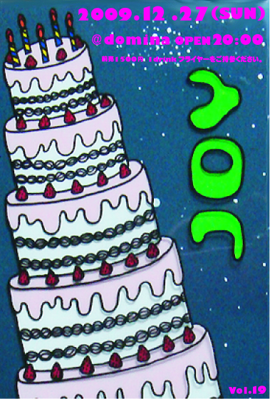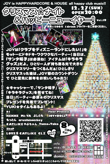 YES!まっきー☆告らせてくれ! 12月「クリスマス☆ナイト &ハッピーニューイヤー!」 JOYは「クラブをディズニーランドにしたい!」をモットーに ドキドキ・ワクワクなパーティー!当日は、クリスマスも終わった27日の日曜日の夜。 僕たちのクリスマスは27日まで!みんな頭に『サンタ帽子』で待ってます! 当日のアイテムは『キラキラグッズ』だよ。JOY☆DOLLのショーの後にクリスマスツリーをつくるんだぁ! ひとり一人が持ち寄る光で大きなキラキラで眩い光のファンタジーを! そして、その後は「JOY☆カ