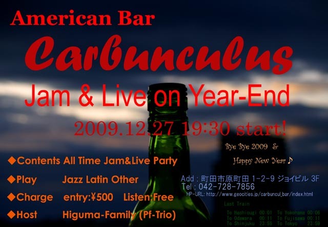 っつぅことで 皆さまお待たせ〜ぇ!! 今年もやりますよ〜ぉ“厄祓い”の Jam & Live Party♪ 日ごろ 町田Jamで鍛えた腕や喉で 勝ち抜き腕自慢大会しまひょ〜♪ \(∵)/ (っとっと…“勝ち抜き”は 予定に御座いません (-_-) ●日時:12月27日(日) 19:30頃開演〜23:30頃終演 ●場所:American Bar“Carbunculus”(カーバンクル)    ⇒町田市原町田1-2-9 ジョイビル3F (JR町田駅南口徒歩1分 ネコビル3F) ●内容:事前エントリ制の対バンライブぱーちー♪ (Jazz, Latin, Other) ●置き楽器:キー坊(生ピは無いっ!!),ドラム,各種アンプ類,マ