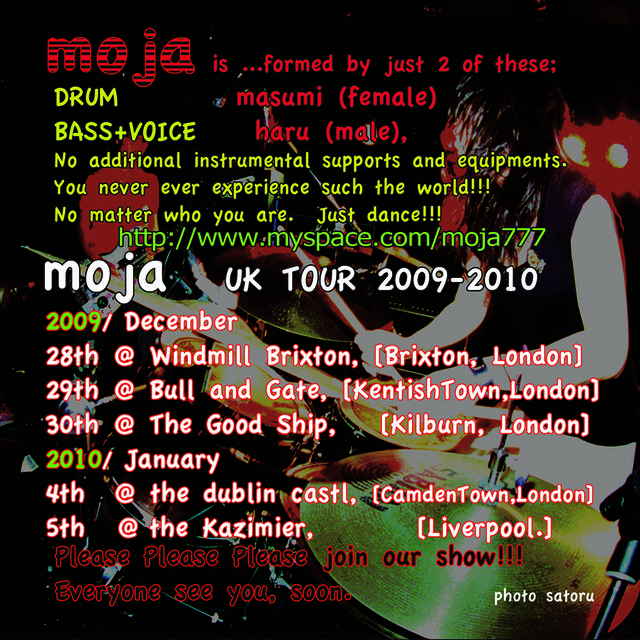今年の終わりから新しい年明けにかけて〜 moja Live in London 行ってきま〜〜す!!!!!! 来年はまた世界挑戦の日々です!! 冬のロンドン、年末年始のロンドン等 色々ロンドン情報知っている方からの情報お待ちしてま〜〜す!!!!! Schedule is as below; December 28th @ Windmill Brixton, [Brixton, London] http://www.windmillbrixton.co.uk THE BIG JUGS EXPERIENCE - Direct from Japan!!! Cutting edge clubnight debut in Europe for the first time after 50-plus successful shows in Osaka and Toky