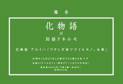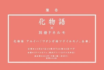別冊ドネルモ トークイベント 《化物語 あるいは「私が持っているものぜんぶ」》 ●日時 : 12月27日(日) 19:00-20:30 ●会場 : TRAVEL CAFE(博多グリーンホテル天神店) ●パーソナリティ:古賀琢磨(社会学系おたく研究者)× 山内泰(ドネルモ ディレクター)× 梅田ひとみ(猫好き) ●ファシリテータ : 原口唯(女子学生) 他愛もない〈好きなキャラ〉語りから、作品の持つ社会的・文化的なコンテクストまで、 様々なテーマが飛び交うトークライブ《別冊ドネルモ》、 次回は、アニメ『化物語』(原作:西尾維新/監
