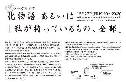告知させていただきます。 福岡近郊にお住まいのみなさま! はじめまして。 福岡発の文化系サイト「ドネルモ(http://donnerlemot.com/)」と申します。 来月の27日(日)午後7時から、 福岡市天神のトラベルカフェ(http://www.travelcafe.co.jp/shop/tenjin/index.shtml)にて、 「化物語」をテーマにしたトークライブを開催いたします。 http://donnerlemot.com/2009/11/1227.html ■■別冊ドネルモ■■ 《化物語 あるいは「私が持っているものぜんぶ」》 ●日時 :12月27日(日) 19:00-20:30 ●会場 : TRAVEL