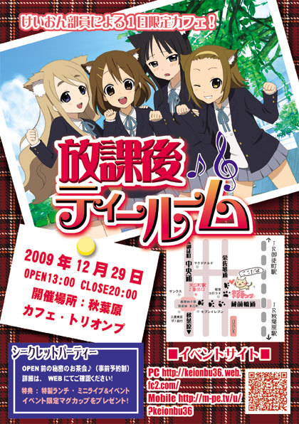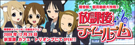 けいおん!の1日限定カフェ開催! ■放課後ティールーム■ 開催日:2009年12月29日 時 間:OPEN13:00 CLOSE20:00 場 所:秋葉原 カフェ・トリオンプ ●とある高校の軽音楽部メンバーが部員勧誘をかねて、  一日限定カフェでみなさまをおもてなし致します!  カフェにいらした方は、軽音楽部に仮入部していただき部活に  参加して頂きます。  とっておきのスペシャルメニューやゲームをお楽しみください♪  突発ミニイベントやミニライブも企画中です!  みなさまの仮入部お待ちしております!! 【