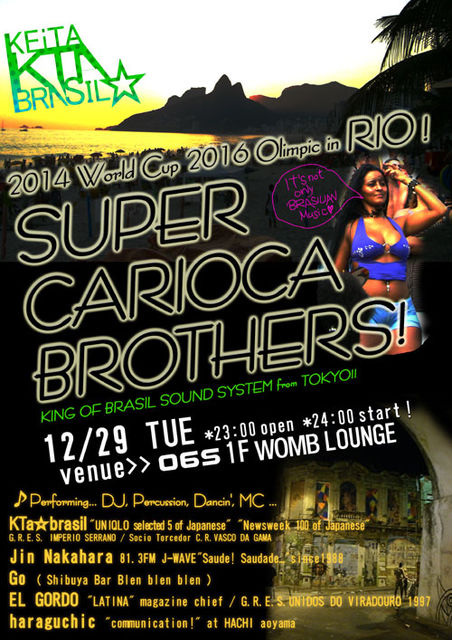 KTa☆brasil apresenta 【Super Carioca Brothers!】 at WOMB LOUNGE feat.2014 Wcup/2016 Olimpic in RIO DE JANEIRO!! 2009年末忘年会スペシャル!!祝☆W杯・オリンピックin RIO DEJANEIRO!! ブラジル・日本での確かなキャリアとセンス。日本で最も若者のファッション・音楽・エンタテイメントシーンで活躍するKTa☆brasil(ケイタブラジル)による企画。 ブラジルや大ラテン圏のゴキゲンなノリをクラブシーンに注入☆ ☆真冬から真夏へ!!ゴキゲンビーチパーティー仕様♪♪♪ より広いシーンにブレイクスルーできるセ