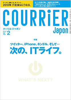みなさん、あけましておめでとうございます。 今年もどうぞよろしくお願いいたします。 さて、1/9に発売のクーリエ2月号の特集は、 「次の、ITライフ。」 http://courrier.jp/contents/index.html 内容はずばり「IT」です。iPhoneに、ツイッター、キンドル……、 いま多くの革新的なITサービスが登場し、私たちのコミュニケーションや ビジネスのありかたを大きく変えつつあります。 2010年はさらに、テレビ、音楽、本、ゲームなど、 私たちの日常生活の隅々にまでITが浸透していくことになるでしょう。 今後どういうIT