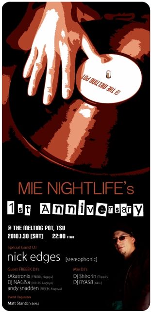 大成功だったMike McKenna (Discoscience) in Mie!に続いて、MNL一周年を記念するためのpartyを開催します!