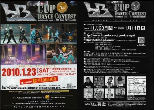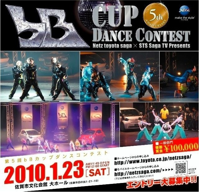 イベント出演情報です。 Netz toyota saga X STS Saga TV Presents bB CUP DANCE CONTEST 5th Anniversary (第5回bBカップダンスコンテスト) にKMCがGUEST LIVE出演いたします。 日 時:2010年1月23日(土) 場 所:佐賀市文化会館 大ホール (佐賀市日の出1-21-10) AM11:45 OPEN / PM12:00 START ついに第5回目を迎えた今年も、ジュニア部門と一般部門に分けて開催! 最高のステージで熱いダンスバトルが繰り広げられます! 審査員ゲスト:GAZILOW はむつんサーブ、I