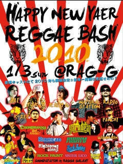 告知失礼します。 豪華キャストにて2010年も開催決定☆ 一年に一度のBIG BAAAASH!!! 新年一発目は見逃せない!! BACK SWING ENT.PRESENTS -HAPPY NEWYEAR REGGAE BASH 2010- 2010/01/03(SUN) OPEN 21:00-4:00 @RAG-G(佐賀市松原3-54) ADV:2500YEN ADM:3000YEN ※前売チケットは全国のローソンでもお買い求めになれます。 ローソンチケット Lコード:86903 ※前売りチケット完売の場合、当日券の発売はございません。 -SPECIAL SHOWCASE- ・たなけん(東京)ROAD TO 横浜レゲエ祭2K9優勝 ・TAK-Z(大阪)