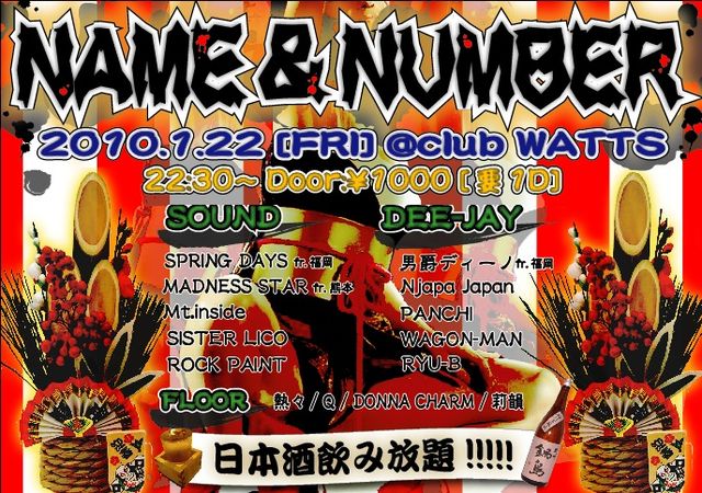 ■■NAME&NUMBE■■ 1/22 [fri] 22:30〜 @club WATTS (佐賀県佐賀市愛敬町4-10 ZEST ビル5階) door:\1000[要1D] ※日本酒飲み放題!!!! ■SOUND■ Spring Days fr.福岡 MADNESS STAR fr.熊本 Mt.inside SISTER LICO ROCK PAINT ■DEE-JAY■ 男爵ディーノ fr.福岡 Njapa Japan PANCHI WAGON-MAN RYU-B ■FLOOR■ 熱々-hot hot- Q DONNA CHARM 莉韻-LION- 今年1発目のName&Numberは、福岡・熊本からがっつり現場を湧かせている注目の2サウンドをお迎えしての新年会スペシャル