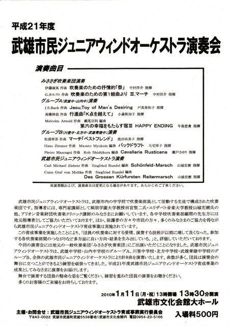 武雄市内の中学校吹奏楽部の合同楽団 武雄市民ジュニアウインドオーケストラ 今年は1月11日にコンサートがあります みささぎ吹奏楽団も単独で演奏することになりました 1月11日 13時開場 13時半開演 武雄市文化会館 大ホール 入場料 500円