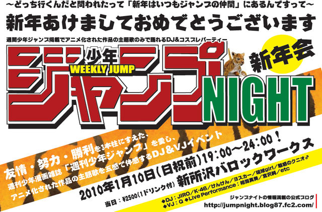 新年会企画のお知らせです。 この日は会場をジャンプ、ワンピース愛に溢れた新所沢の、 「バロック・ワークス」に移しVol.15.5と題しまして、新年会ムードで開催したいと思っております! もちろん今回の“ジャンプナイト”も一晩ジャンプ楽曲づくしのお祭りです。 内容、興奮度共に、 最高テンションを続け2010年に探し物探しに行くのさ! いつもの皆さん、そしてもちろんはじめてご参加の方も大歓迎ですよ。 今回もお誘い合わせの上、ご予定頂けます様よろしくお願いしますね! “ジャンプナイトVol.15.5” 〜どっち行くんだと問われ