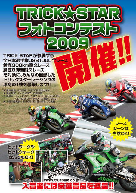 「TRICK★STAR Racingフォトコンテスト2009」開催されます!! 2009年のJSB1000シリーズと300km、8耐が対象で レース場でのトリスタチームの写真を募集。 締め切りは11/30発送分まで(予定)。まだまだ先は長いですが。 応募は1人10点まで。 応募者が撮影した写真に限ります。 ※携帯電話カメラでもOK ※できればコンパクトカメラ以上が望ましいです (写真データの大きさ等の関係で) ●応募方法・・・・・・・・・・・・・・・・・・・・・・・・・・・・・・・・・ ●●これぞ!という写真をCD~ROMに焼いてトリスタナゴヤ(トゥルー