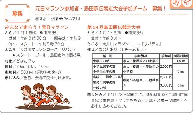 「11月1日にリバティで大規模に開催したので、これは無いだろう」 …と思っていましたが、来年の元旦も開催するようです。 (情報源:広報しまだ12月1日号) タイムスケジュール 受 付:午前8時30分〜 開 会 式:午前9時00分〜 スタート:午前9時30分〜 ところ 大井川マラソンコース「リバティ」 集合場所は、島田市陸上競技場 対象 どなたでも 種目 2キロ・5キロ・10キロ 参加料 500円 申し込み 当日、会場受付 【追記】 広報しまだの