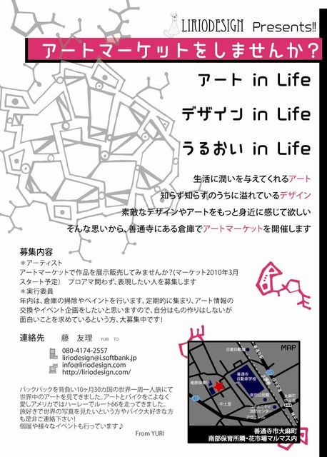 こんにちわー! LirioDesign 創業に向け、日々がんばってます ゆぅの将来の目標、それは、世界中のアーティストさんを呼べるギャラリーを作ること なので、今からその下準備をしたいと思います まだ、場所、日程等は未定ですが、アートマーケットがしたいです 絵を描いたり、アクセサリーを作ったり、何かグッズを作ったりしている方で集まってみんなの作品を販売するアートマーケット 最初は小さくてもいいんです。みんなで楽しい場所を作りたい こちらのコミュを窓口として、アートマーケット
