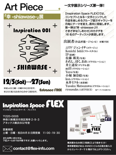 ■□■□■□■□■□■□■□■□■□■□■□■□■□■□■□■□ 横浜に新しく産まれたばかりの 【Inspiration Space FLEX】でアート展示に参加しませんか? コンセプトとなる一文字とリンクした作品を楽しめるグループ展示を、 月毎にテーマを変え、週末ギャラリーとして開催しています。 ■□■□■□■□■□■□■□■□■□■□■□■□■□■□■□■□ 昨日、ヨコハマ経済新聞のヘッドラインニュースにFLEXが紹介されました! http://www.hamakei.com/headline/4586/ ------------------------------------------------------
