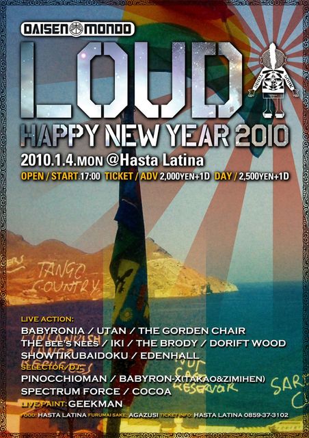 LOUD HAPPY NEW YEAR 2010 2010,1/4,mon @Hasta Latina OPEN/・START.17:00 TICKET/ADV2000yen1D LIVE ACTION: BABYRONIA/UTAN/THE GORDEN CHAIR THE BEE'S NEES/IKI/THE BRODY/DRIFT WOOD SHOWTIKUBAIDOKU/ SELECTOR/DJ: PINOCCHIOMAN/BABYRON-X SPECTRUM FORCE/COCOA LIVE PAINT GEEKMAN Drift Wood 2010 一発目楽しみますよ〜 よかったら 一緒に踊りましょう
