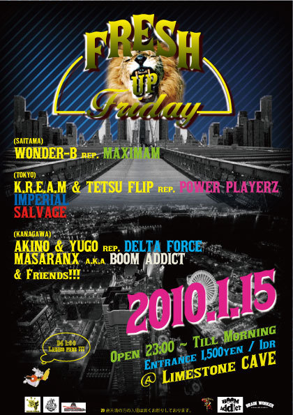※管理人様、告知失礼致します。 1/15(Fri) @Limestone CAVE (横浜市中区元町1−31 la spega motomachi B1) "FRESH UP FRIDAY" OPEN: 24:00〜 ADM: 1,500yen w/1drink (※ 1時まで女性入場無料!!!!) ■MUSIC BY WONDER-B rep. MAXIMUM K.R.E.A.M & TETSU FLIP rep. POWER PLAYERZ IMPERIAL SALVAGE AKINO & YUGO rep. DELTA FORCE MASARANX a.k.a BOOM ADDICT & friends !! Supported by BRAIN WORKER DESIGN. <FRESH UP FRIDAY> AKINO、YUGO (DELTA FORCE)にMASARANX a