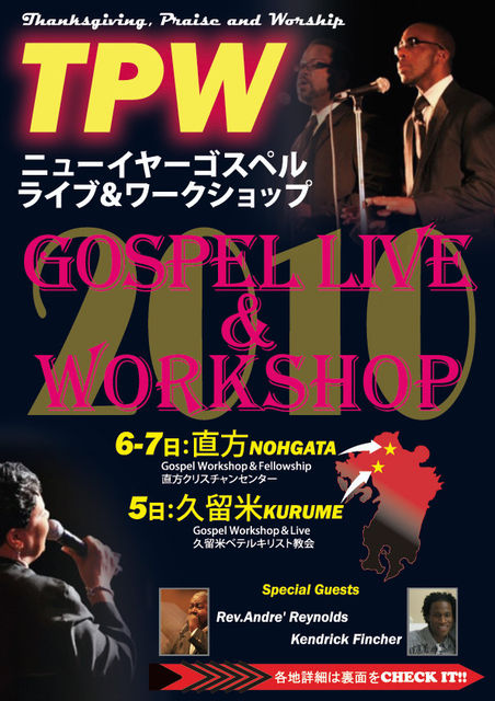 やってきます アラバマから 彼らが 九州は福岡のツアーですが お近くの方、ぜひぜひ是非是非ゼヒゼヒ いらしてください TPWニューイヤーゴスペルライブ&ワークショップ <久留米> ゴスペルライブ 1月5日(火曜)19:30〜 入場料 高校生以上/1000yen 小・中学生/500yen WSクワイヤとともに新春早々アツいライブを楽しもう ゴスペルワークショップ 1月5日(火曜)14:00〜 本場アメリカのゴスペルを体験!