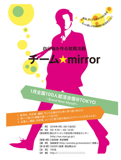 就活ゼミ第一回と埼玉大学編に参加した、明治大学の荒木津香佐と申します。 本日は、私が所属している学生団体の就活イベントの告知をさせていただきたく、参上しました(*^_^*) 私は今、就活支援団体チーム★mirrorという団体に入っていて、自分の軸を作る就職活動をしよう!!というテーマのもと活動をしています。 こちらも就活ゼミと同じく、mixiを媒体としています。 (⇒読むのめんどいぜ!って方はポチっとな♪ http://mixi.jp/view_community.pl?id=4173563) 就活ゼミの意識高い皆さんに、少しでも興味を持っていただけたら