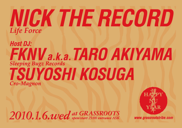 さっそく2010年もスタートしましたが、早くもウィーク・デイから『EXCLUSIVE!!』ご存知NICK THE RECORDがやって来ます!! ホストDJにはSleeping Bugz代表、FKNV a.k.a. TARO AKIYAMAとCro-MagnonのTsuyoshi Kosugaの音の安心コンビがサポート!!