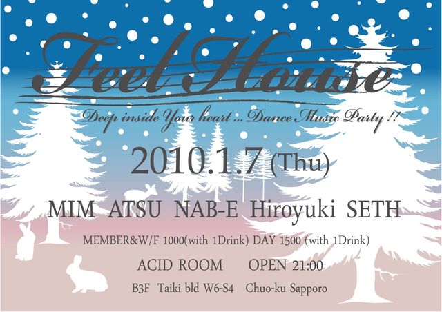 2010/1/7(THU) ■DJ's >>MIM/ ATSU/ NAB-E/ Hiroyuki/ SETH ■OPEN 21:00 ■WF&ACID MEMBER \1000/ DAY \1500 @ ACID ROOM(札幌市中央区南4条西6丁目タイキビルB3F ) 【ACID ROOM HP】http://www.acidroom.jp/top.html