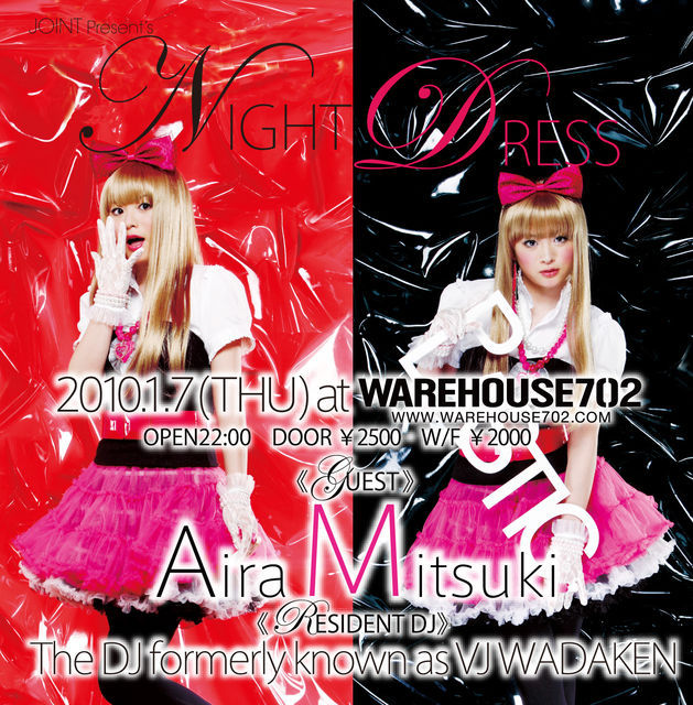 2010年一発目! 木曜日にして都内最大級のウィークデーモンスターイベント『WHAT'S UP?』 二年目の区切りを迎え『NIGHT DRESS』としてリニューアル。 レギュラーDJとしてThe DJ Formerly Known as VJ WADAKEN。 VJとして国内外を飛び回り、輝かしい経歴を持つ彼のDVJオフィシャルパーティー。 そして数々のパーティーを成功させてきたJOINTがタッグを組み新しいパーティーのカタチを提案する。平日にも関わらず豪華なゲスト二本立てのスタイルが他のパーティーの追撃を許さない。 今回はVocalistとして天性の才能を持つAira Mitsukiを昭