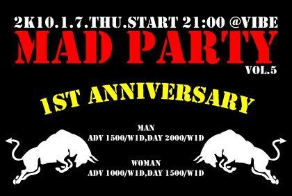 MAD PARTY vol.5〜M.B. 1ST ANNIVERSARY〜 2010.1.7(THU)@VIBE OPEN21:00〜 MAN:ADV/1500w1D,DAY/2000w1D WOMAN:ADV/1000w1D,DAY/1500W1D ・GUEST SOUND 〜HIGHER IDEAL fr.SAGA〜 〜ROCK DOM RULERZ fr.KUMAMOTO〜 ・DJ,SOUND KOHEI MORICK ACKEY KO-SK KAZZHI ・HOST SOUND MAD BUFFALO 新年会MI SEH