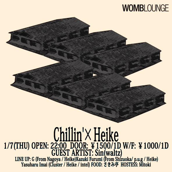 管理人さま、コミュニティ参加のみなさま 01/07(木) WOMB LOUNGEにて行われるパーティの告知をさせてください。 どうぞよろしくお願いいたします。 ● ● ● ● ● ● ● ● ● ● ● ● ● ● ● ● ● ● ● ● ● ● ● ● ● ● ● ● ● ● 01.07 (THU) CHILLIN'×HEIKE OPEN: 22:00 DOOR: \1500/1D W/F: \1000/1D MUSIC: MINIMAL/HOUSE/TECHNO GUEST ARTIST: SIN (WALTZ) LINE UP: G, KAZUKI FURUMI, YASUHARU IMAI FOOD: SAKIMI-TEI HOSTESS: MITOKI PLACE: WOMB LOUNGE Guest Artist Sin (waltz) 1