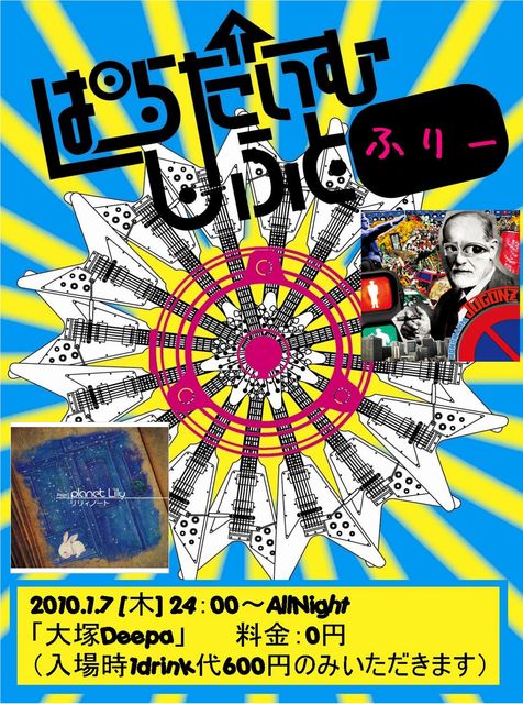 予約受付開始です。 入場料無料のイベントですが、人数把握のため参加される方は 予約受付にご協力ください。 ご予約いただいた方には当日特典を検討中です。 お名前と枚数、リクエスト曲を明記の上、 「イベントに参加する」ボタンをクリックしてください! ■□■□■□■□■□■□ 【ぱらだいむしふと ふりー】 2010.1.7[木] 24:00〜AllNight 「大塚Deepa」 料金: 0円 (入場時1drink代600円のみいただきます。) ■フジファブリック特集を行います ▼GUEST ACT▼ ◇リリィノート http://lilynote