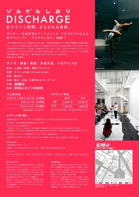 おりていく時間、さらされる身体。 ダンサー・多田汐里とアートユニット・ゾルゲルプロによる新プロジェクト「ゾルゲルしおり」始動します!! [上演日時] 2010/1/8(金)20:00 1/9(土)19:00 1/10(日)15:00 開場は開演の30分前 [会場] STスポット http://stspot.jp/ 横浜市西区北幸1-11-15横浜STビルB1 横浜駅西口徒歩8分 [料金] 一般(前売)2,000円 一般(当日)2,300円 学生(前売)1,500円 学生(当日)1,800円 学生の方は公演当日、学生証をご持参ください。 [チケット取り扱い] チケット申込みフォーム http://danc