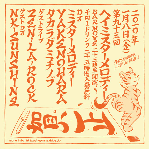 管理人様、告知失礼します 今週金曜、今年一発目の「HEY MR.MELODY」 93回目です! ゲストは去年名盤「THE NIGHT OF ART」をリリースした ZEN-LA-ROCK & BTB とNK-SUNHINE!! さらに、やけのはらBIRTHDAY BASH!! HEY MR.MELODY Vol.93 2010.01.08(fri) @MOVE(横浜・長者町) http://heymr.exblog.jp/i3/ TEL 045-243-0999 23:30 START \1000(1D) ※25時まで入場無料! [GUEST LIVE] ZEN-LA-ROCK & BTB [GUEST DJ] NK-SUNSHINE [DJ] ミスターメロディー やけのはら タカラダミチノブ [詳細] http://hey