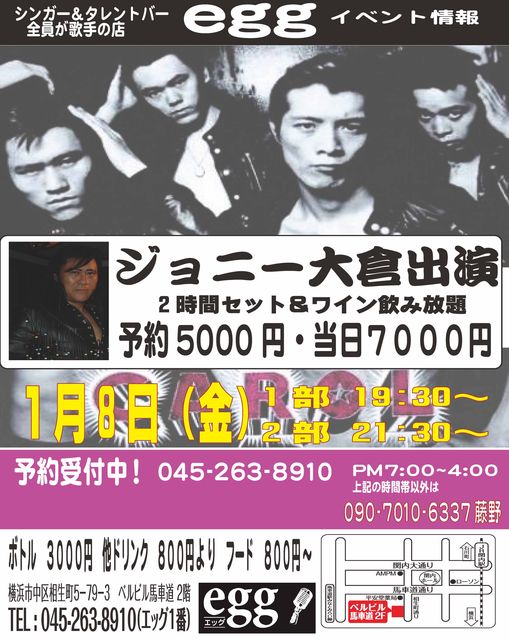 いま、語っておきたいことがある、口べたなジョニーが重い口を開く、キャロルから現在にいたるまで、キャロル夜明け前の執筆に協力した、藤野氏が経営するシンガー&タレントバー eggに再び降臨。 予約5000円 当日7000円 http://eggshow.p1.bindsite.jp/event/event.html Access 住所 神奈川県横浜市中区相生町5-79-3ベルビル馬車道2F 営業時間 営業時間 : PM 8:00〜AM 4:00(平日営業・日祝祭日休み) 電話 & FAX : 045-236-8910(エッグ1番!!) 電車でお越しの方へ 京浜東北線・関内駅 北出口。みなとみらい線・