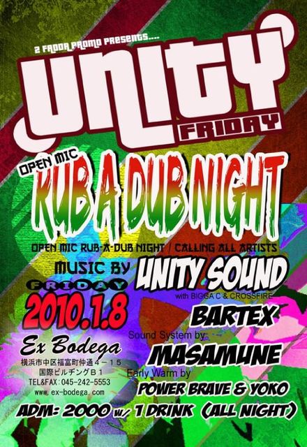 RUB A DUB NIGHT - OPEN MIC!!! □SOUND UNITY SOUND BARTEX MASAMUNE with SOUND SYSTEM □EARLY WARM YOKO from SWEET TING ROOTS SOUND □OPEN/START 23:00〜 ADM: 2000 YEN + 1 DRINK □UNITY FRIDAY http://mixi.jp/view_community.pl?id=3165697 * [ex-bodega]* * * 横浜市中区福富町仲通4-15 国際ビルヂングB1 TEL:045-242-5553 http://www.ex-bodega.com/contents/index.html * * * * * * * * * *