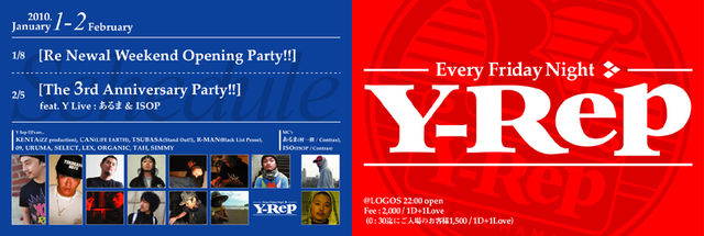 Discount ご希望の方は、当日の23:00までに告知者にお問い合わせください。 ---Every Friday Night--- 『Y-Rep』@yokohama LOGOS Open:22:00 Fee:2,000/1D+1Love (0:30迄にご入場のお客様1,500/1D+1Love) *新年一発目のトピック 1/8 [Re:Newal Weekend Opening Party!!] *来月には三周年も迫っております 2/5 [The 3rd Anniversary Party!!] feat. Y Live:あるま&ISOP ---Y Rep DJs are--- KENTA(ZZ production) CAN(Life Earth) TSUBASA(Stand Out!!) R-MAN(Black List Posse) 09 URUMA SELECT LE