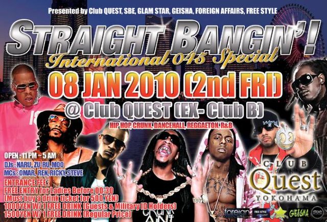 今週の金曜日夜(1月8日)、クラブQUEST 横浜にてSTRAIGHT BANGIN'が開催されます。 ☆☆☆女性入場無料!(12時半まで/ 入場時500円にて1ドリチケ購入要)☆☆☆ お客さんが主役のDJオンリーHIP HOPパーティーです。 横浜を代表するかなり盛り上がる熱いイベントです。本物のパーティーヘッズが集まる、おもいっきり楽しめるパーティーです。 是非遊びに来てください! ◆ 前回のパーティー写真(直リンク): http://www.sbe-one.com/files/SBE_QUEST_12112009_photogallery.jpg ★“SBEのゲスト”と入場時に言っていただければ、