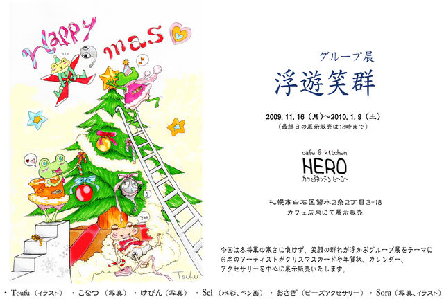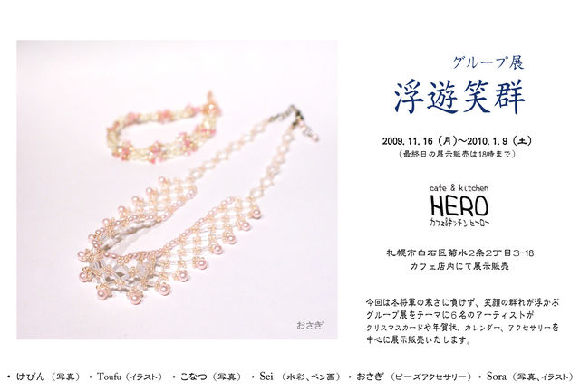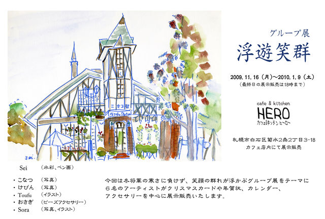 2009.12.28 更新 cafe&kitchen HERO(カフェ&キッチン ヒーロー) グループ展企画 第3弾 グループ展「 浮遊笑群 」 2009年11月16日(月)〜2010年1月9日(土)開催 (11月23日(月曜・祝日)お休み) 搬入日 11月14日 18:00〜20:00 又は 11月16日(月)18:00〜20:00 搬出日 2010年1月9日(土)の 18:00〜20:00 出展者メンバー 6名 初・ けびんさん (写真) 初・ こなつさん (写真) 初・ おさぎさん (ビーズアクセサリー) 初・ Sei (水彩、ペン画) ・